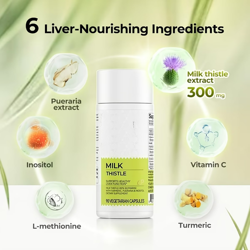 Milk thistle seed extract, with antioxidant properties, helps repair the liver and relieve discomfort during recovery after staying up late. It is rich in vitamin C, inositol and kudzu root components. Each capsule contains 300 mg of extract, and each bottle has 90 capsules.